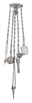 by William Comyns, Birmingham 1901, the pierced plate depicting a figure of Justice holding balls under her arms, leading to five chains, the links modelled as putti heads, suspending a mechanical pencil marked 925, a wheel form pin cushion, an etui case and thimble, and a vesta case