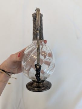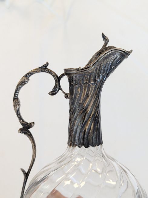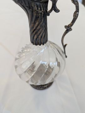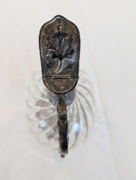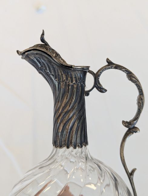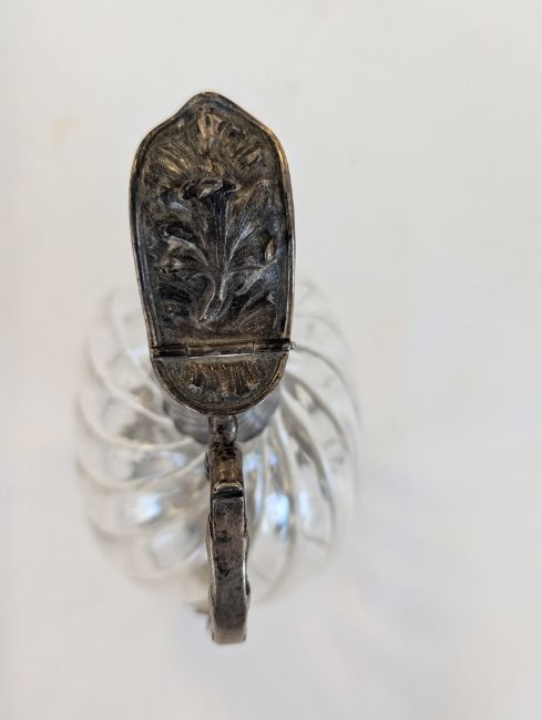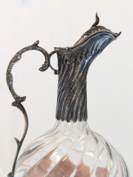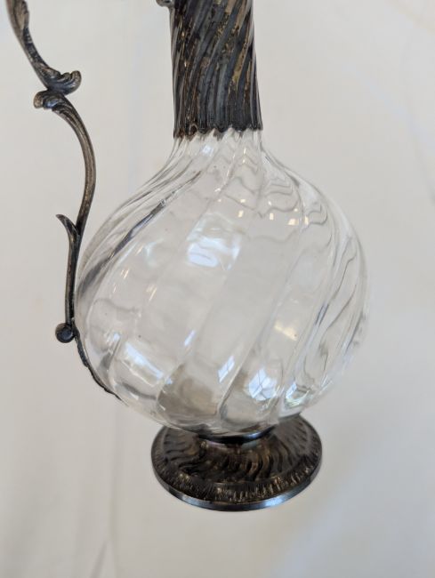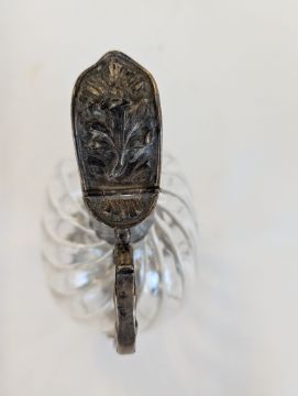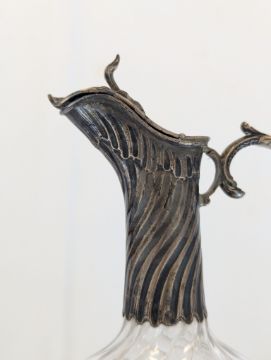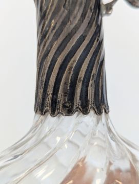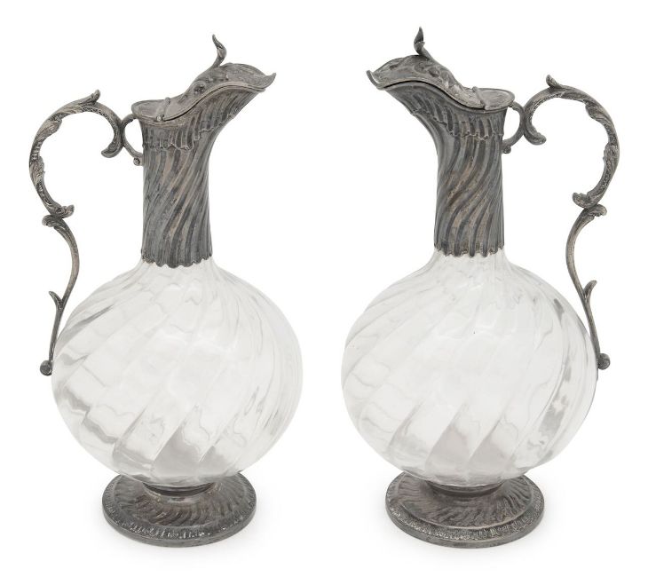 Minerva mark, with acanthus leaf spouts and handles, to moulded crystal glass bodies, raised on circular pedestal bases (2)