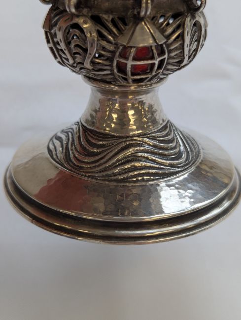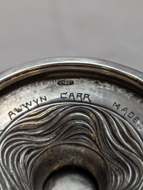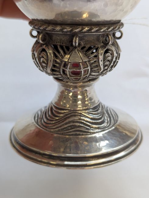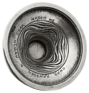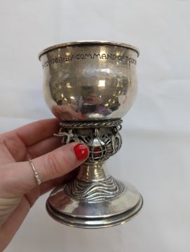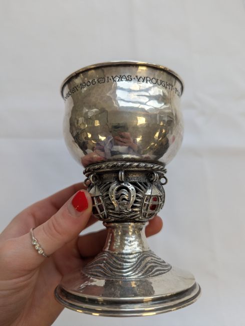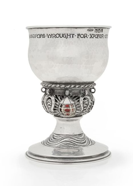 London 1905, the planished bowl inscribed 'I was wrought for Xpofer Swainson-Cowper by command of T. Cowper-Essex 1906', above a rope-twist border, to a knopped stem decorated with horseshoes and lanterns inset with red glass cabochons, to a spreading circular base, with a relief decorated wave pattern, the underside inscribed 'Omar Ramsden & Alwyn Carr Made Me'.