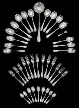 by Josiah Williams & Co, London 1928, comprising a ladle, six soup spoons, three tablespoons, seven table forks, six dessert spoons, six dessert forks, five teaspoons, four coffee spoons, and a cruet spoon, the reverse with the engraved crest of the Ansdell family, depicting a hand holding a buckle (39)