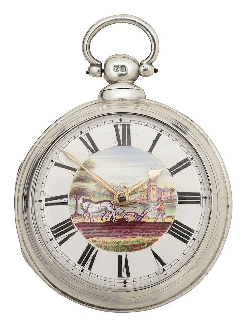 key wind fusee movement with verge escapement, regulation lever annotated fast/slow, unnamed, no. 56561, Roman enamel dial with white chapter ring and central painted polychrome vignette depicting plough team in pastoral landscape, case maker mark for Philip Woodman & Sons