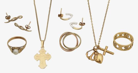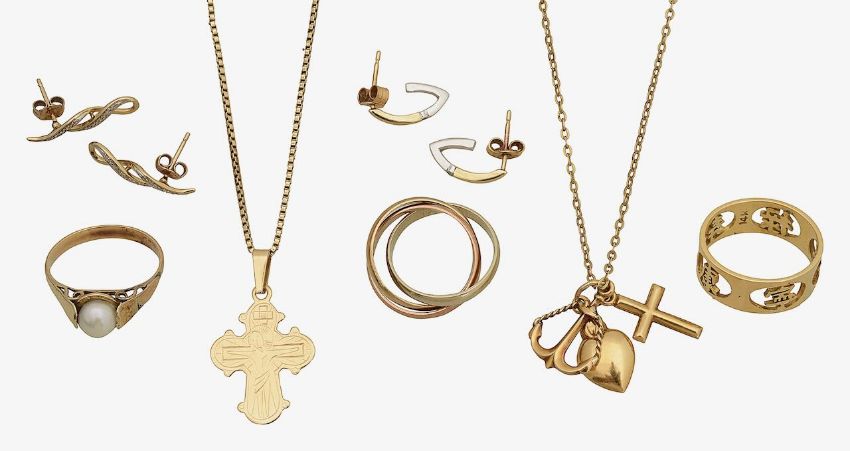 featuring a 9ct Russian wedding band, two sets of diamond ear rings, 9ct box chain with cross, necklace with charms, a pearl ring and a band ring (7)