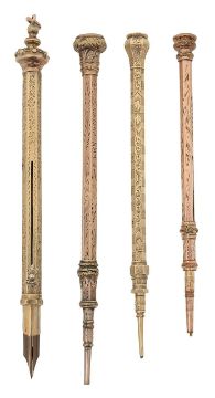 late 19th to early 20th century, mostly modelled as columns, comprising three with hardstone finials, and engraved foliate decoration, including a dual propelling pencil and fountain pen example (4)