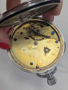 Condition: Dial in good condition. Key-wound movement is fully wound but is not running and appears jammed, it will require complete service and overhaul. Case has old minor dents, scuffs and marks throughout. No winder.