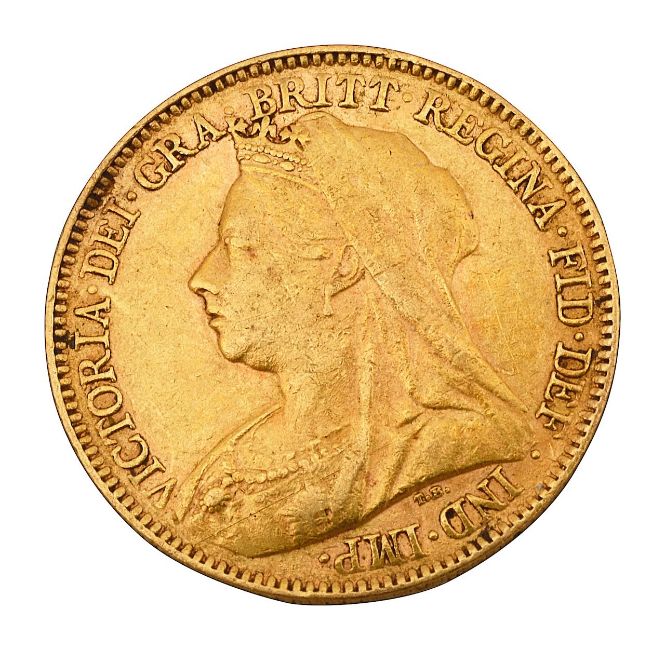 obverse: Older veiled bust of Queen Victoria facing left, Saint George slaying the dragon to reverse