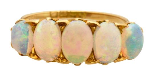 with 18ct London hallmark 1906-07, five graduating oval cabochon opals in a claw setting with scroll work and tapering band