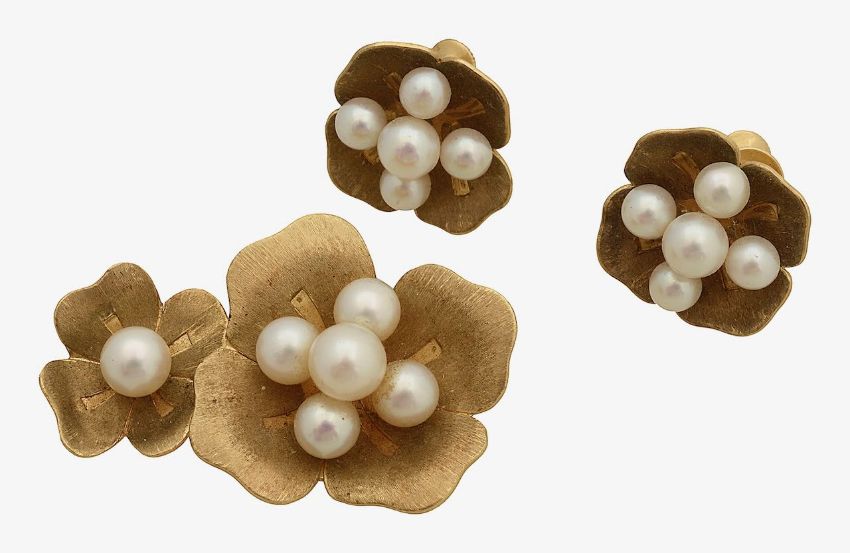 with 14k stamp to rev, a stylised buttercup flower brooch with a cluster of five pearls centrally set attached small flower head with a single pearl textured petals together with a matching pair of ear clips with screw backs set with a cluster of five pearl centrally set(2)