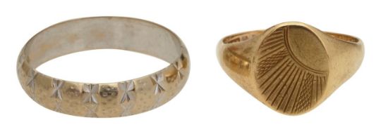 with 18ct hallmark, diamond cut textured band and a 9ct hallmark, oval signet ring with textured detail to head(2)