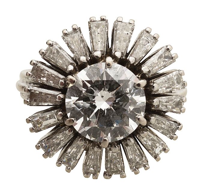 with an old cut diamond centre and a skirt of matching calibrated tapered baguettes, wire work collet and trifurcated band
