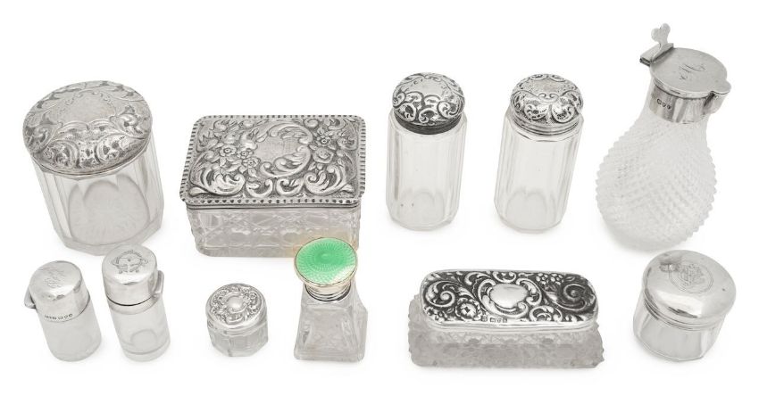 Victorian and later, to include a jar with a green guilloche enamel lid, six with repousse scrolled lids, four with engraved initials, and a cut glass condiment bottle (11)