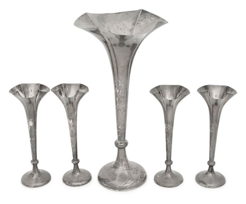 A set of four Edward VII silver bud and a larger trumpet vase