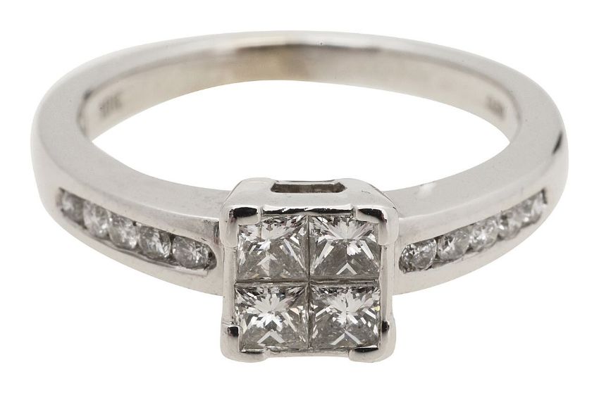 with 18ct and 0.50ct stamp to the inside, a four stone princess cut diamond cluster elusion with channel set shoulder stones