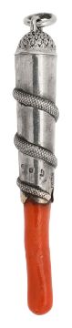 by William Lea & Co., Birmingham, 1814, of elongated form, the coral held within tubular casing, entwined with a snake, hanging hoop to end