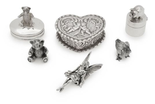comprising a heart-shaped box, decorated with winged putti, marked 925, another pill box and tooth box, both marked 925, mounted with a seated bear and a pig, and three modern figures of a seated fairy, duck and teddy bear (6)