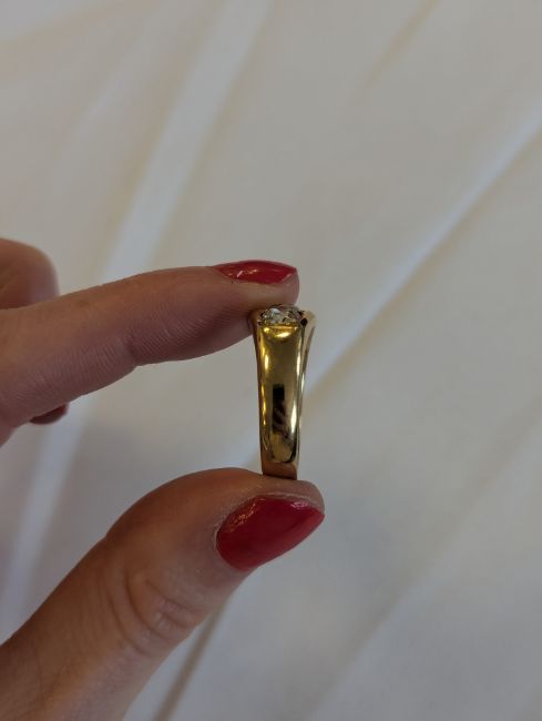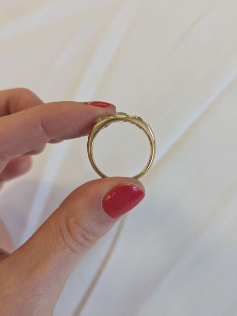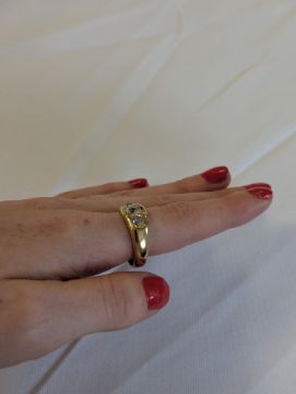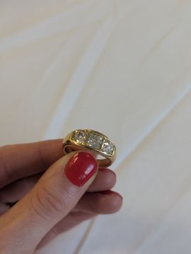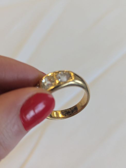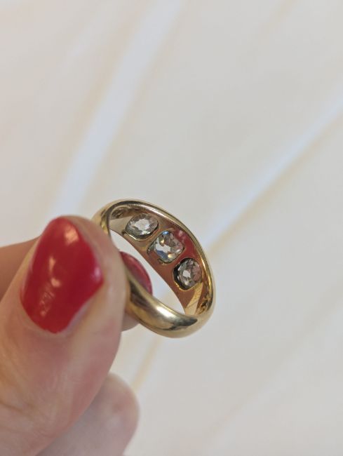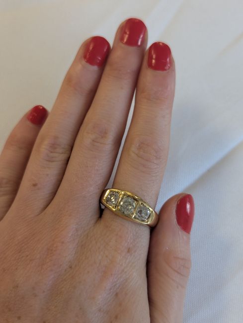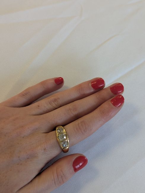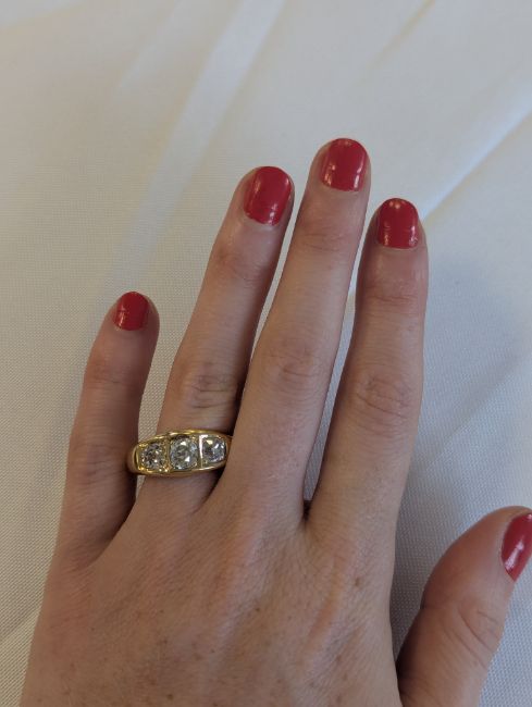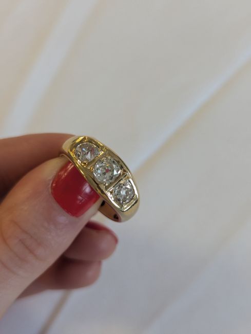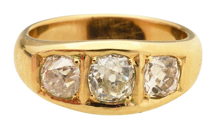 the three graduated cushion-shaped old brilliant-cut diamonds gypsy-set to the wide tapering shank