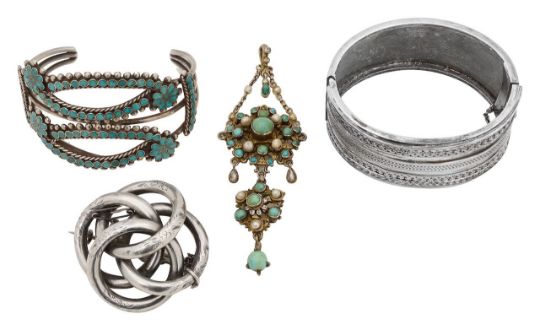 A silver love knot brooch, a Navajo turquoise mounted silver cuff and others