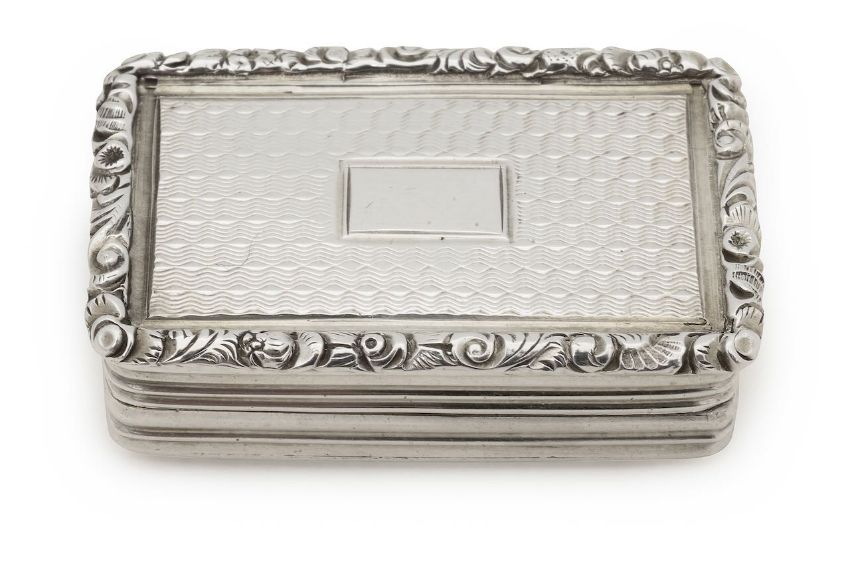 by Joseph Willmore, Birmingham 1833, the top with a vacant central rectangular panel, to engine-turned decoration and a foliate embossed border, opening to reveal a gilt interior, with a pierced floral grille