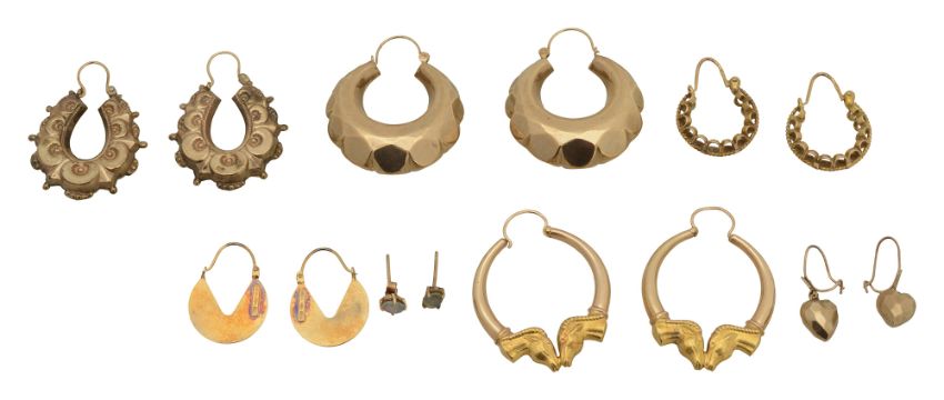featuring three sets of 9ct ear hoops, a pair of 9ct hallmark, horse head hoops, Italian style 9ct Italian style ear hoops, small heart drops and a pair of opal doublet studs (7)