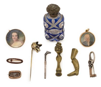 comprising a printed portrait roundel of a young lady, in an 18ct gold case, with hair to the reverse, another similar example of an older lady, a silver brooch marked 800, a silver toothpick, modelled as a horse, marked 925, a silver gilt hat pin modelled as a fox, with red glass eyes,two small gold brooches, inset with red paste stones, and plaited hair, a blue cased glass snuff bottle, and two brass pipe tampers (9)