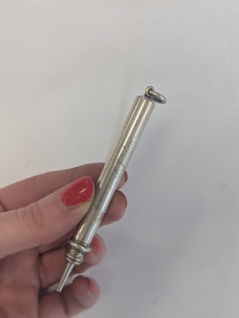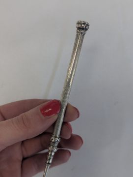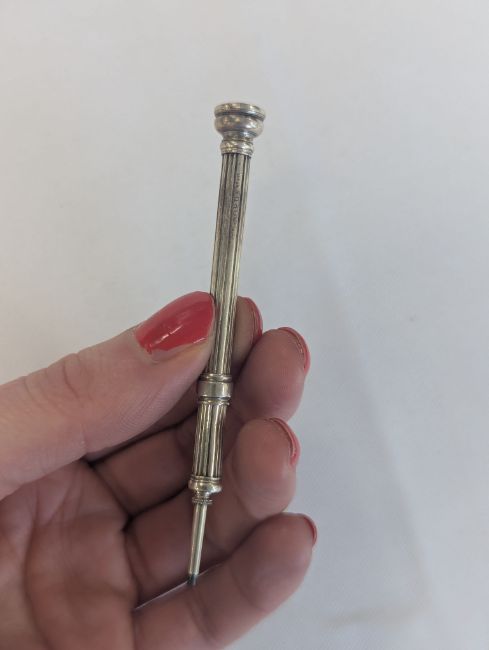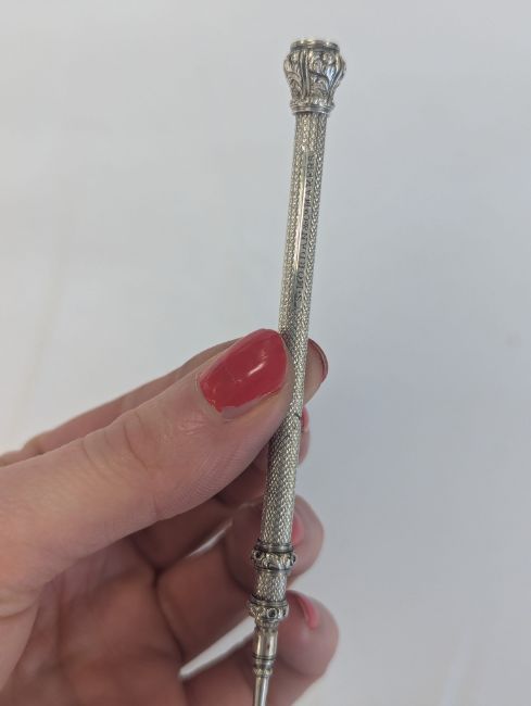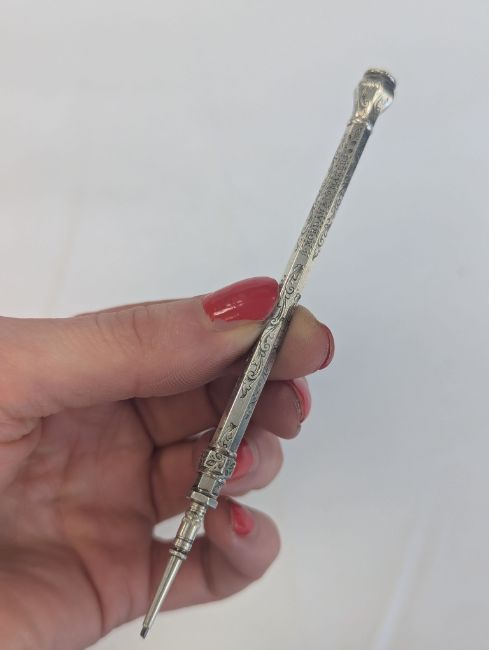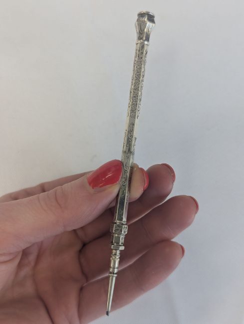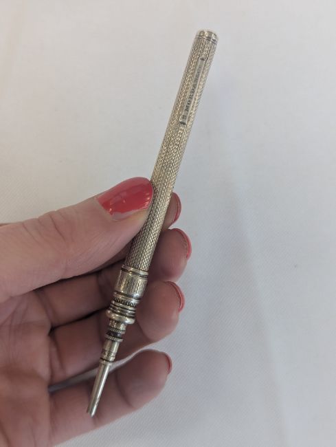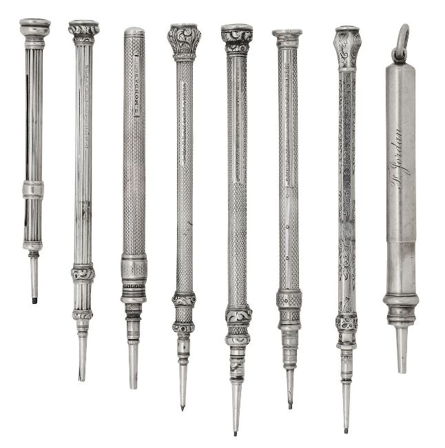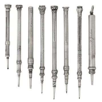 A group of nine Sampson Mordan silver propelling pencils each with engine-turned and engraved foliate decoration, the ends with hardstone seals (8)