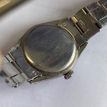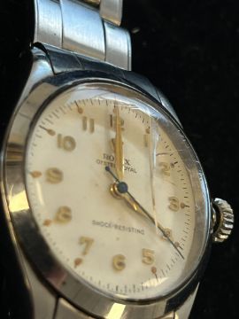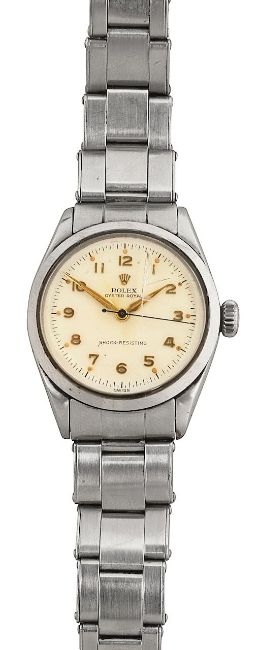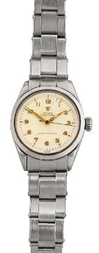 A stainless steel Rolex Oyster Royal Shock-Resisting wristwatch,white Arabic dial with gilt numerals, dot markers, insignia and hands, minute and seconds track, marked 'Swiss', releief insignia to crown, on stainless Rolex braceletCase number 6246dial 25mm diameterCondition: heavy scratch to glass, various smaller scratches, minor marks and wear etc. Winds smoothly, appears to be in working order