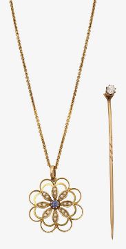 the brilliant cut diamond approx 20 points, together with a pierced flower pendant set with seed pearls with sapphire to centre on a fine chain marked 9ct (2)
