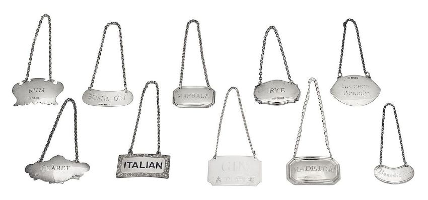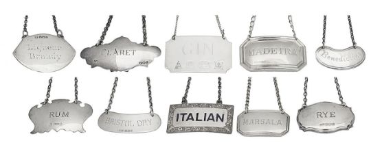 A group of ten silver decanter labels,