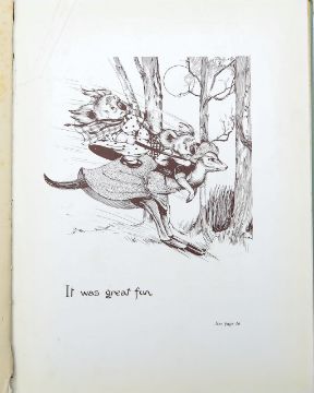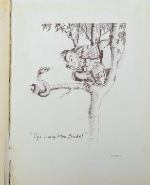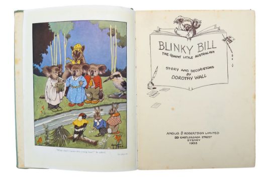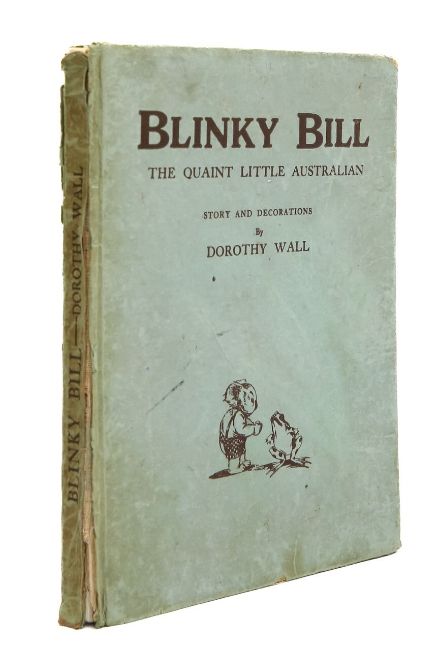 Wall (Dorothy), 'Blinky Bill: The Quaint Little Australian.'Sydney: Angus & Robertson Limited, 1933.First edition, 4to, hardcover bound in blue / green cloth, pictorial front board and lettered spine. Plain end-papers. Frontispiece with full page colour illustration "'What shall I name this young bear?" he asked. See page 10 (chapter 1, The New arrival). pp.70, [1], with nearly 100 sepia drawings throughout, 14 fine brown and white plates with reference pages, (total pp.84). After-word on how one (children) should treat a koala; 'If any little girl or boy should be the proud owner of a koala, please remember the poor wee thing cannot eat sweets, fruits, nuts or ... etc. ...,' with author's printed signature below; (Halstead Printing Company Limited, Arnold Place, Sydney)25 x 20cm.Condition: Provenance. From a Private Collection of children’s illustrated books formed over the past fifty years.