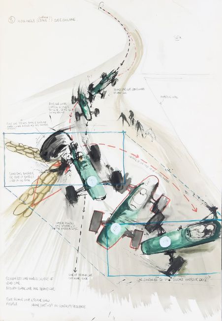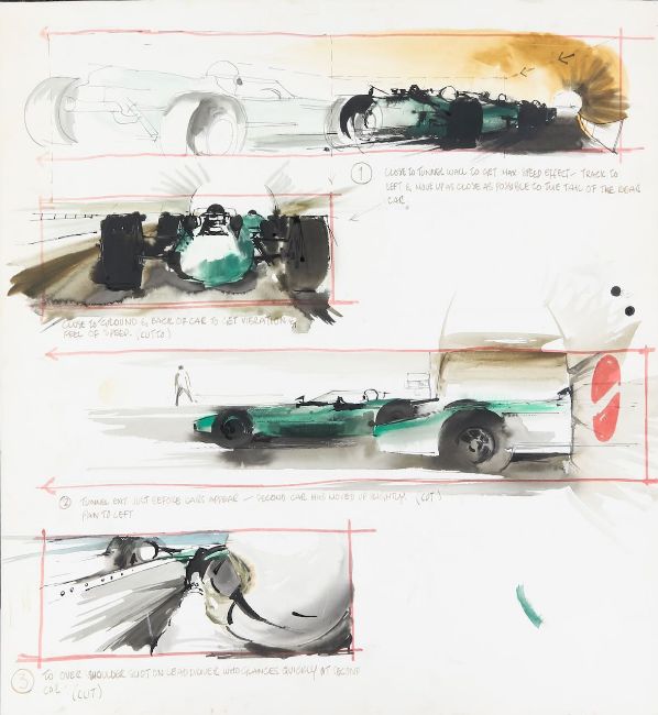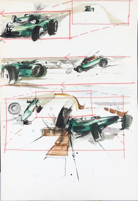 Motor Racing ephemera: Three story boards depicting racing cars possibly for Grand Prix 1966 movie or similar