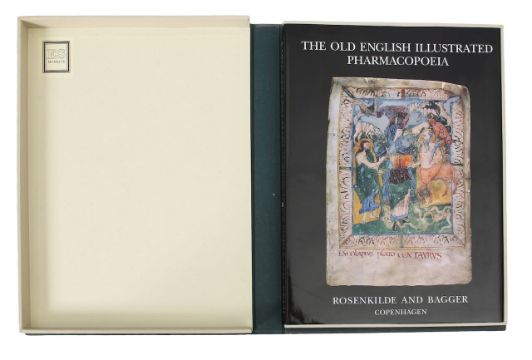 D'Aronco (M. A.) & Cameron (M. L.), 'The Old English Illustrated Pharmacopoeia'British Library Cotton Vitellius C III.Copenhagen: Rosenkilde & Bagger, 1998.Volume 27 in the Early English Manuscripts in Facsimile series. Folio, in slipcase, softcover wrappers with illustrated dust jacket reproducing Plate II from the manuscript (British Library, Cotton Vitellius C. iii, fol. 19r); full colour facsimile of the manuscript with commentary, pp. 64 [facsimile], c. 119 [commentary], 8 colour plates and 87 black and white illustrations reproducing the manuscript's 200+ herbal and animal miniatures. A facsimile of the only surviving illustrated Old English pharmacopoeia (c. early 11th century, possibly Canterbury or Winchester), originally part of Cotton Vitellius C III. The manuscript contains herbals, animal remedies and spells in Old English, Latin, Anglo-Norman and Greek, compiled into a richly illustrated medieval medical compendium. An important scholarly edition making this unique manuscript accessible to researchers in medieval medicine.40 x 30cm.Condition: