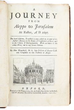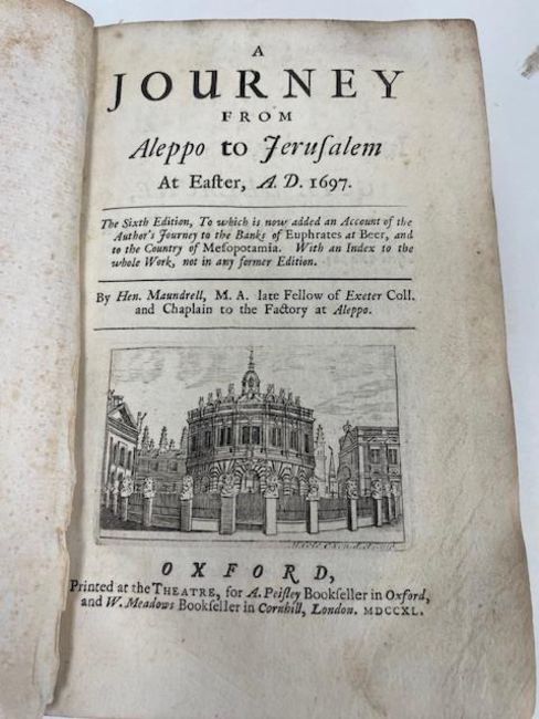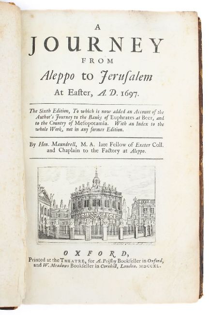 Maundrell (Henry), 'A Journey from Aleppo to Jerusalem at Easter', A.D. 1697. 'The Sixth Edition, To which is now added an Account of the Author's Journey to the Banks of Euphrates at Beer, and to the country of Mesopotamia. with an Index to the whole Work, not in any former Edition...' 'Printed at the Theatre, for A. (Peistley?) Bookseller in Oxford, and W. Meadows Bookseller in Cornhill, London. MDCCXL.'