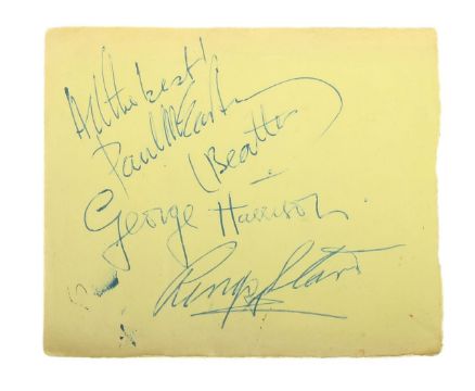 comprising signatures for Paul, Ringo and George, all in blue pen on a single page from an autograph