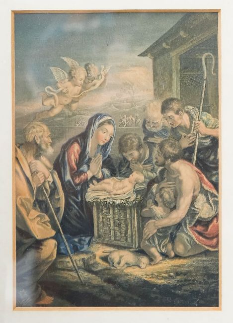 6) Print: 'The Birth of the Saviour' by George Baxter (1852). Gilt frame, glazed and mounted.