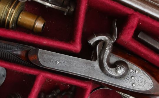 29" hardened barrels, ramrod below, top inscribed John Lyell Union Street Aberdeen, engraved lock plate inscribed John Lyell with foliate scroll and hound detail to both sides, trigger guard with elaborate elongated finial, worked grip to walnut stock, butt plate; with associated fitted case, bearing Joseph Riley label and with accessories (2)