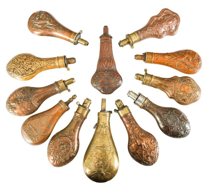 Fourteen Victorian brass and copper powder and shot flasks