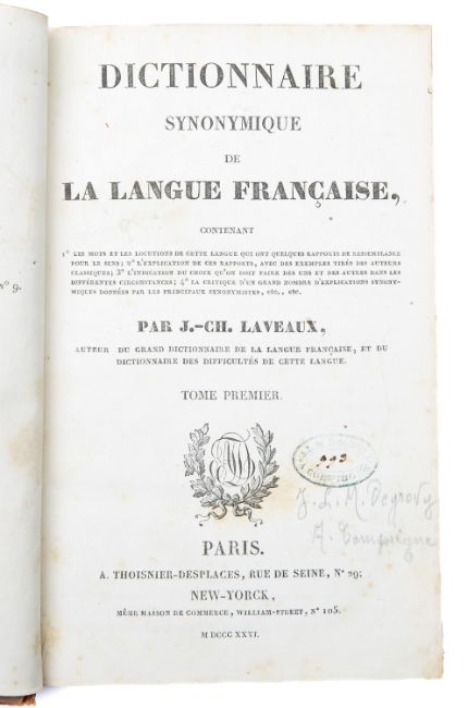 Boyer (A.) 'The Royal Dictionary , French and English and English and French: Extracted from the Writings of the Best Authors in Both Languages', London: Printed for D. Midwinter et al. 1742, engraved title page in red and black ink, complete A to Z, marbled endpapers, full calf binding, gilt tooled and titled spine, raised bands; together with 1783 New Edition, Tome Second; also Laveaux (J.-Ch.) 'Dictionnaire Synonymique de La Langue Francais' two volumes, Paris: A. Thoisnier, 1826, calf bound; with a further volume (5)