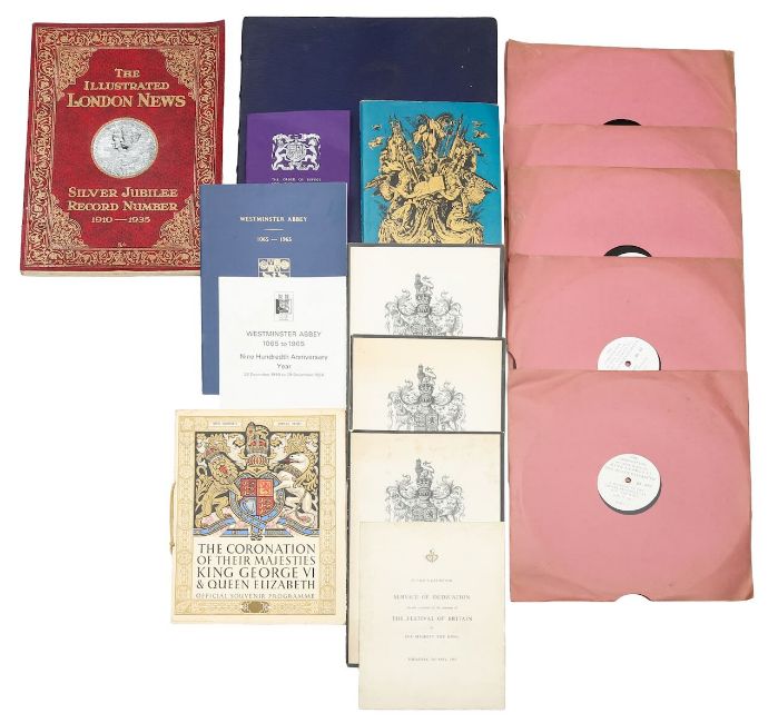 set of 1937 Coronation vinyl records; two copies of order of service for funeral of King George V; 1937 Coronation of King George VI souvenir programme; various Westminster Abbey related etc. (qty)