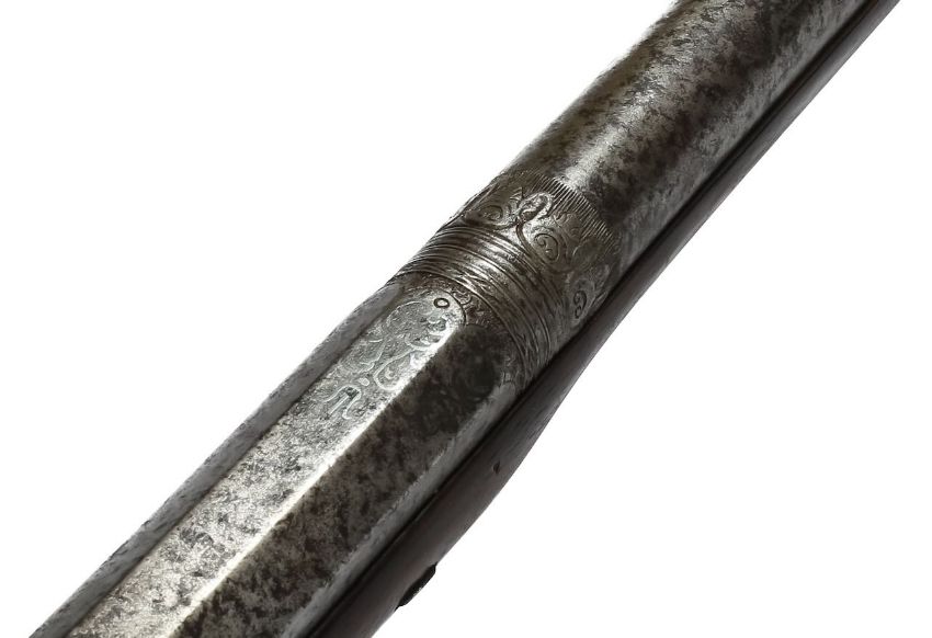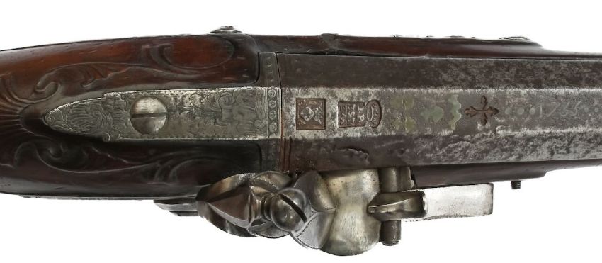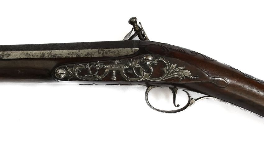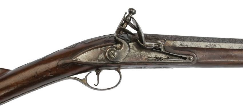30" barrel with engraved band and octagonal upper section, with proofmarks and date 1755ramrod below, plain lockplate inscribed Deakin, opposite decorative pierced foliate scroll mount, steel trigger guard with decorative finial, walnut stock with blank cartouche mount, carved foliate decoration, butt plate
