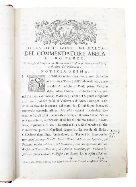 'Malta Illustrata, Overro Descrizione di Malta Isola del mare Siciliano e Adriatico, con le sue antichita, ed altre notizie, divisa in quattro Libri, de Commendatore Fra. Giovanfrancesco Abela, Vice-Chancelliere della Sagra, ed Eminentissima Religions Gerosolimitana, Corretta, accresciuta, e continovata dal conte Giovannanyonio Ciantar...'