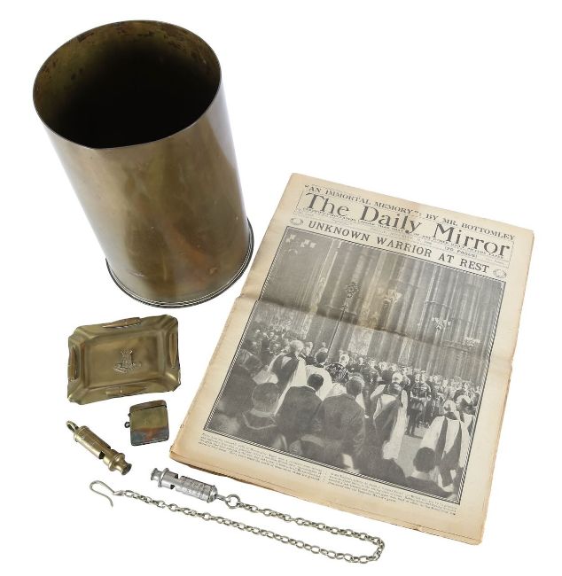 comprising a large British shell casing, stamped 1915, cut-down for use as an umbrella stand; an ashtray, mounted with insignia of St Quenton (Northern France) and three bullet tips; a Vesta case; 'The Metropolitan' whistle; 'The Acme City Whistle- Special Constable Kent' on chain; and a copy of the Daily Mirror, Friday November 12th, 1920, showing first Armistice Day parade past the new Cenotaph (6)