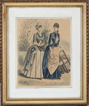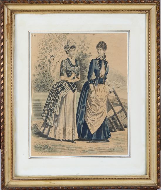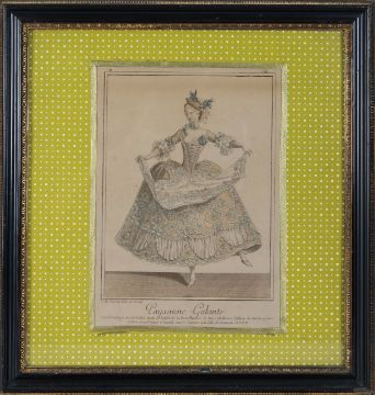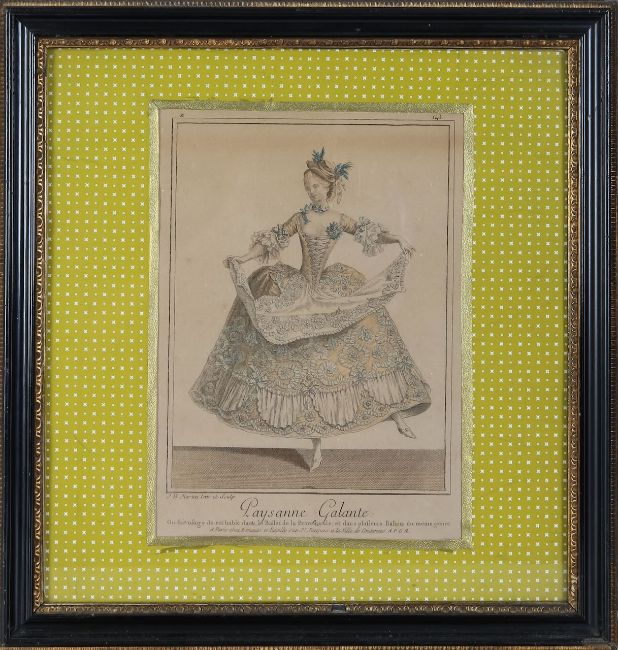 comprising after J.B. Martin 'Paysanne Galante' and 'Thelis', handcoloured, with striking yellow and gilt mounts, Hogarth style frames; together with five further hand-coloured fashion prints; also after Abraham Bosse 'La Dame Reformee' and 'Le Coutisan Suivant Le vDernier Edit Le Lacquay', both hand-coloured, probably later copies; also 'The Three Grand Temptations...' in maple frame (10)