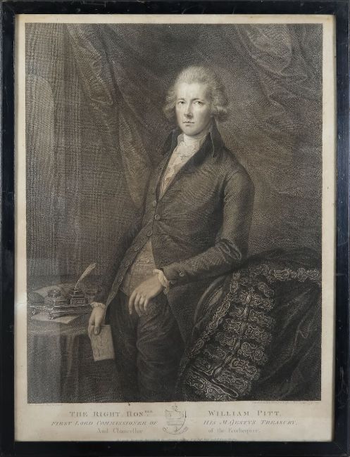 William Pitt the Younger (British, 1759-1806), engraving (after Gainsborough Dupont), 'The Right Honourable William Pitt - 1st Lord Commissioner to His Majesty's Treasury and Chancellor of the Exchequer', painted by Gainsborough Dupont, engraved by F. Bartolozzi, London, 1790, framed and glazed.