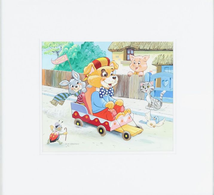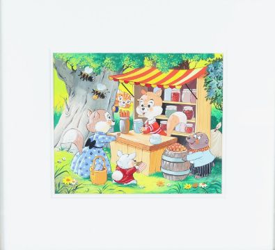 Anthropomorphic animals at market and Animals playing with a toy cart.