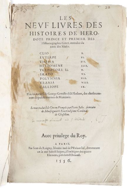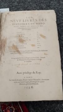 'Les Neue Livres des Histoires de Herodote Prince et Premier des Historiographes Grecz...' Paris: Jean de Roignym 1556; with Rebuffo (D. Pettro) 'Commentariorum in Constitutiones Regias Gallicas...', Lugduni" Ad Salamandrae, 1551; with a further two volumes missing title pages (4)