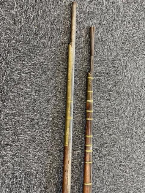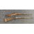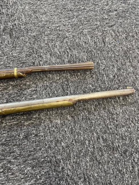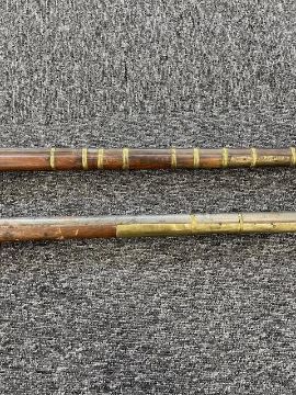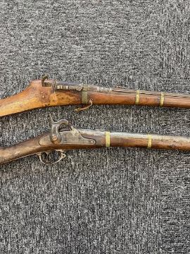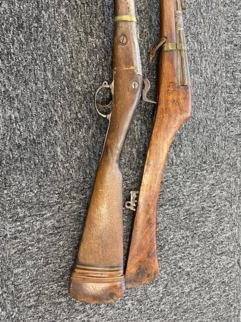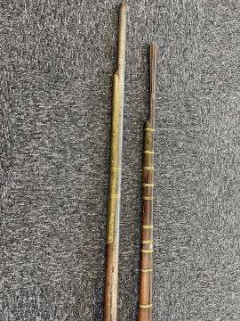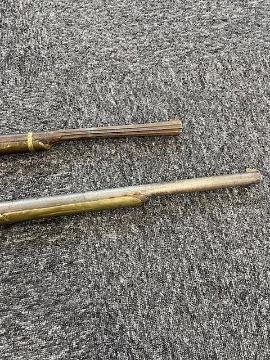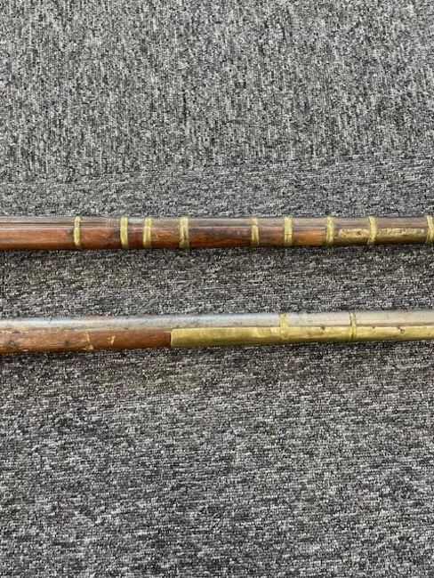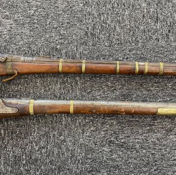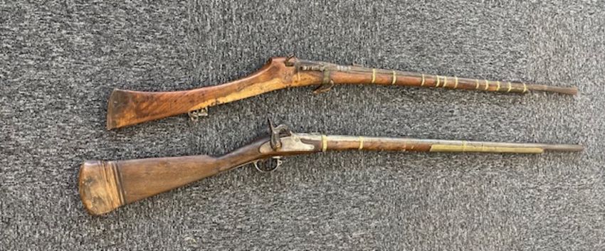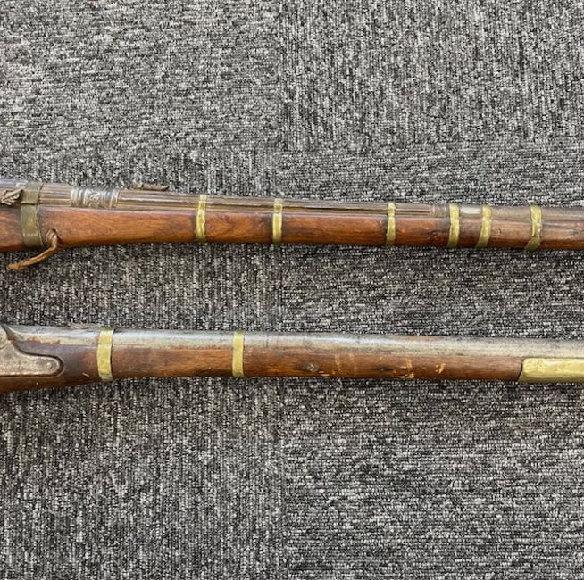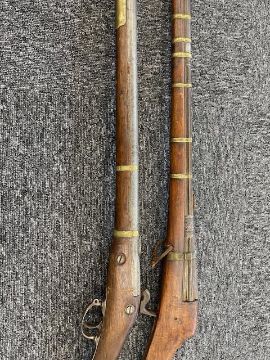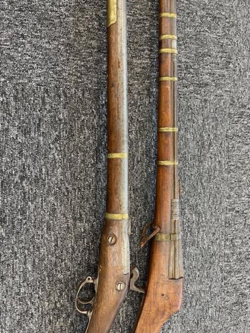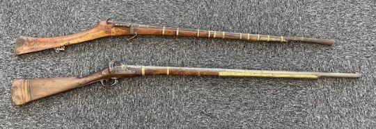 brass banded, pierced stylised trigger to bottom of shaped wooden stock, 140cm in length; together with a percussion musket, brass banded, copper mounts, steel lock, shaped wooden stock, 145cm in length
