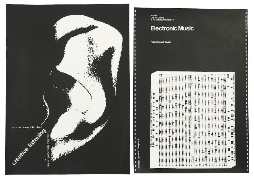 Monochrome screenprints advertising a music lecture by Peter Maxwell Davies (1968), and a listening lecture by Dr. Rachel Pinney (1962), both at City Art Gallery, Leeds together with two Oliver! musical posters advertising the original 1960 London stage production, illustrated by Denis Wrigley (4)