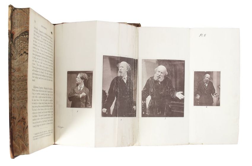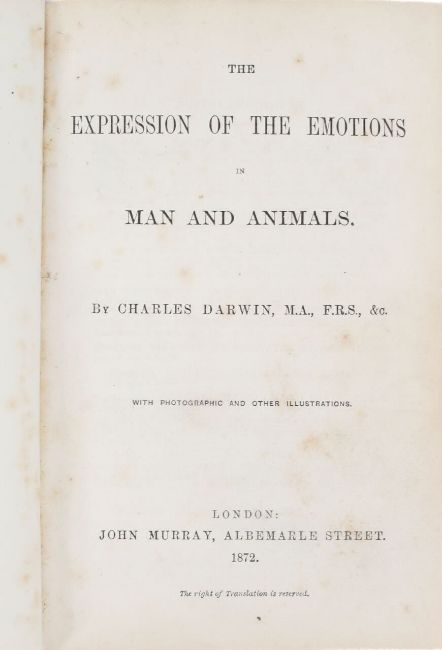 Darwin (Charles), 'The Expression of The Emotions in Man and Animals.'With photographic and other illustrations.London: John Murray, Albemarle Street, 1872. First edition. 8vo. Half calf over marbled boards, spine with five raised bands, compartments with gilt floral tooling, black morocco label lettered 'Expressions Of The Emotions' in gilt, marbled edges and endpapers. [xvi], 374pp., 7 heliotype plates (numbered I-VII), several in-text woodcuts.19 x 12cm.Condition: