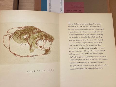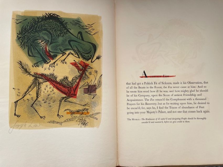 2) This folio is accompanied with an additional fable; 'A Cat and A Cock' on Rives paper (30 x 23cm). Published by Eden Hill Press 1967, translated and illustrated by L' Estrange and Low. Signed and numbered (73) by Joseph Low; 'In its original form this was of a number of signatures prepared by various artist's and printers for the West Virginia Pulp and Paper Company's portfolio, "Homage to the Book." With the sponsor's permissions, 150 extra signed and numbered copies have been run off Rives paper for friends of the printers and of the artist in December, 1967.'