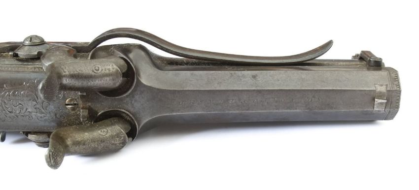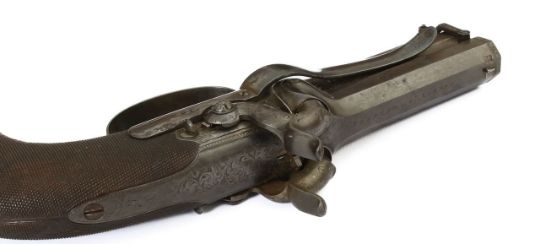 two 3" facetted barrels, top named, swivel ramrod below, twin hammers, engraved foliate lock plates and hammer guard, worked walnut grip