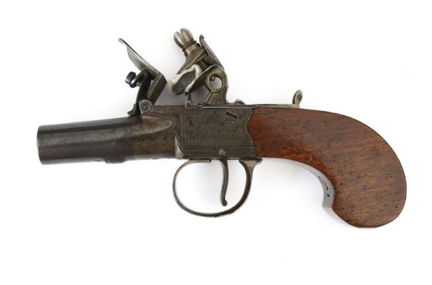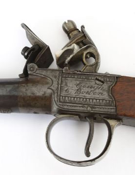 2" barrel, engraved and named lock plates, sliding safety, trigger guard, flat sided walnut grip